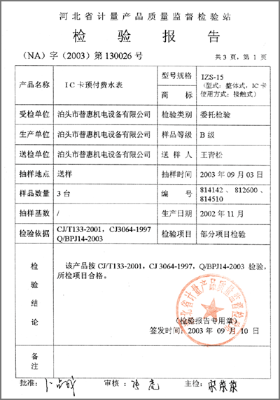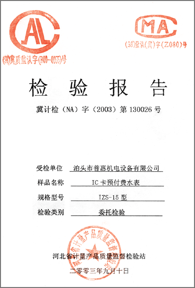 檢驗(yàn)報(bào)告 “IC卡預(yù)付費(fèi)水表IZS-15型”