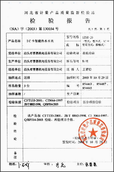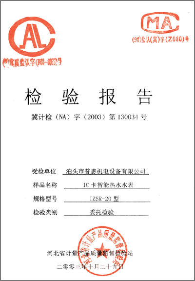 檢驗(yàn)報(bào)告 “IC卡智能熱水水表IZSR-20型”