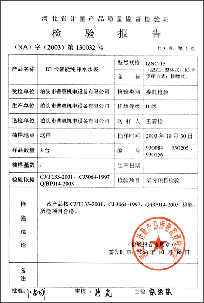 檢驗(yàn)報(bào)告 “IC卡智能純凈水水表浸泡純凈水”