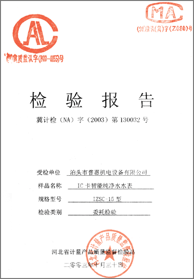 檢驗(yàn)報(bào)告 “IC卡智能純凈水水表IZSC-15型”