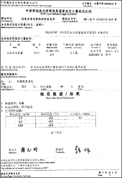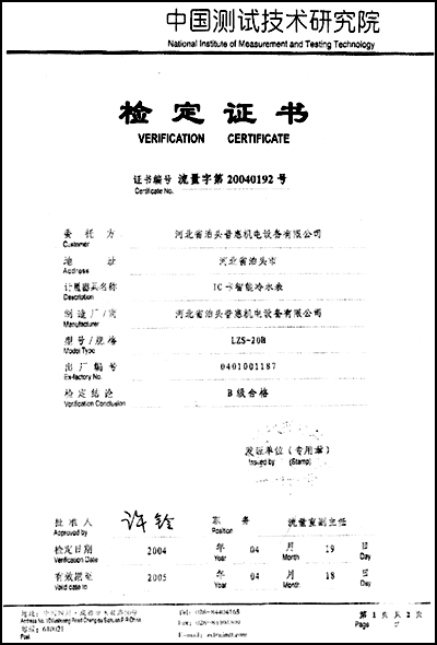 中國測試機(jī)術(shù)研究院檢定證書“IC卡智能冷水表 20040192號”